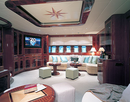 Спустившись вниз, незаметно для себя мы оказываемся не на яхте, а в гостиной особняка. Конструктивно эта часть интерьера напоминает зону отдыха в кокпите – те же два дивана, те же столы овальной и круглой формы. Но фактура применяемых материалов и приемы отделки этого помещения вызывают у владельца и его гостей совершенно другое настроение. В дизайне диванов основной акцент сделан на то, что в них практически нет жестких поверхностей и все углы скруглены до лекальных кривых. Все детали обиты и драпированы. Это провоцирует желание «утонуть» в мягких подушках, водрузив ноги на стоящий рядом пуфик. Поверхность пола покрыта мягким ковром, а стены отделаны красным деревом или заняты мебелью из него же. Эффект сочетания мягкого и теплого здесь достигается максимально. А цвет шоколада и топленого молока делает помещение не просто уютным, оно запечатлевается на уровне подсознания как комната удовольствий. Огромный плазменный телевизор, инкрустация на потолке, мягкий свет настольных ламп – всего лишь детали, делающие желание гостя оставаться здесь дольше, более осознанным. В смежном пространстве расположена кухня.