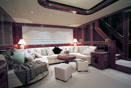 Закрытая часть кокпита визуально разделена на три разные по назначению зоны. Первая из них представляет собой два симметрично расположенных уголка для отдыха и релаксации. По правому и левому бортам яхты стоят диваны П-образной формы. Рядом с диваном по правому борту – один овальный стол, а по левому – два небольших круглых. Вся мебель инкрустирована деревом различных пород, что создает изысканный рисунок фактур. Высота столов регулируется.