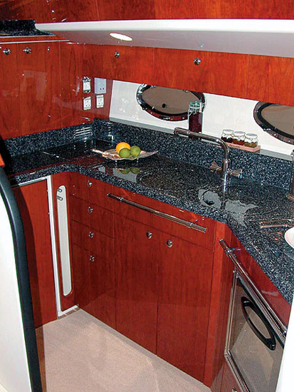 Так, с первоначально ставившимися для американского рынка 425-сильными дизелями Caterpillar, автономность плавания на круизной скорости 23 узла составила 295 миль. Рекомендуемые к установке двигатели — два 430-сильных Volvo Penta TAMD 74L EDC, правда, максимальная скорость при этом будет повыше — 31 узел. Впечатляют результаты испытаний с самым мощным вариантом силовой установки, с двумя 480-сильными Volvo Penta TAMD 75Р EDC. На испытаниях в Америке с ними была достигнута скорость 34,6 узла (данные производителя — 34 узла). При этом автономность плавания даже возросла — на той же экономичной круизной скорости она составила 350 морских миль. На спокойной воде, сбросив 200 оборотов от максимальных, получим автономность в 300 миль при скорости в 30 узлов.