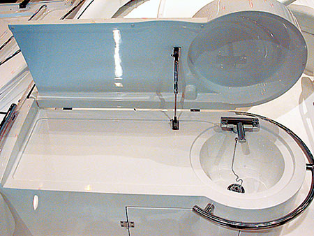 Гораздо эффектнее стало решение флайбриджа. Сохранился набор необходимого оборудования, изменилась планировка мостика. В пользу сочетания чистых форм решен дизайн уголка отдыха и загара. Ансамбль из полукруглого дивана и стола, напоминающего сердцевину этого экзотического плода, жестко ограничен прямой линией тумбы с холодильником, грилем, раковиной. Этот предмет мебели четко разграничивает пространство флайбриджа на рабочее и гостевое. Верхний пост управления яхтой — пространство, лишенное лишних деталей. Приборная доска, три рабочих кресла... бескрайняя гладь моря, переходящая в бесконечность неба. Ничего лишнего, все предельно функционально.