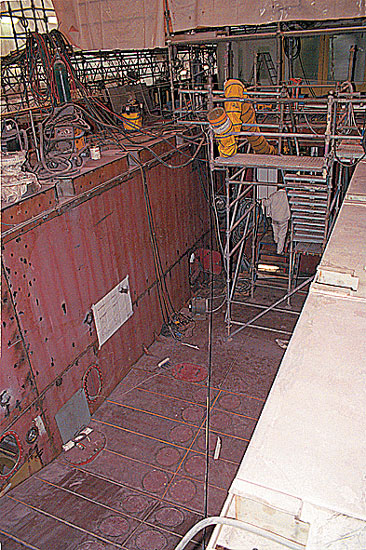 На нижних палубах обеих яхт производилась отделка внешних поверхностей надстройки (грунтовка, шпатлевка, выравнивание поверхности, снова шпатлевание и так до бесконечности), на средней монтировали системы вентиляции и кондиционирования, прокладывали километры силовых кабелей. На верхней, как это ни странно (внизу-то шкурят!), производили поэтапную финишную покраску надстройки. Вообще внешний вид яхты в постройке потрясает. Количество коммуникаций и качество прокладки выдает серьезную работу инженеров-компоновщиков и технологов. Каждый кабель на своем месте, и нет ощущения, что что-то додумывается и перекладывается по месту. Зрелище работающих электриков навевало скуку. Спокойно и без видимых заминок каждый провод находил свое место в проводке и в аккуратно заканчивался на своих клеммах.