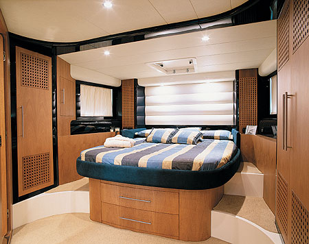 Дерзкое дизайнерское решение – сочетание пластика и дерева. Светлый матовый орех и темно-голубой, почти до синевы пластик создают небывалый антураж роскоши поистине королевской. Кухня убрана с глаз долой «этажом ниже», и от входа в салон вся палуба видна насквозь до самой рубки – салон с U-образным диваном, опоясывающим прямоугольный стол, фантастический бар и пульт управления составляют единое, удивительное свободное и гармоничное целое. Может быть, самое красивое место на всем судне – бар: изогнутая скрипкой стеклянная дуга хромированными стальными трубками крепится к деревянной стойке, а на заднем плане – глубочайшей голубизны шкафчики из пластика с решетчатыми дверцами из ореха.