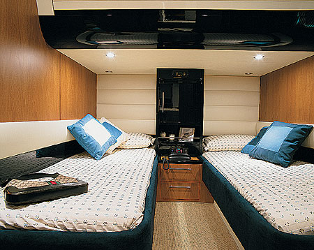 Даже проектировщики затрудняются определить, какая каюта лучше удалась – мастер-каюта или VIP. Мастер-каюта находится почти на миделе; VIP – занимает носовую часть яхты. Для улучшения звукоизоляции она отделена от машинного отделения топливными танками. Обе каюты обставлены с максимальной комфортабельностью – king size двуспальные кровати, гардеробы, диванчики, зеркала. Невероятный контрапункт – легкость кремовых тонов и густота голубого. Две койки в гостевой каюте разделены шкафом с тонированным остеклением. При желании койки можно сдвинуть и получить еще одну двуспальную кровать.
