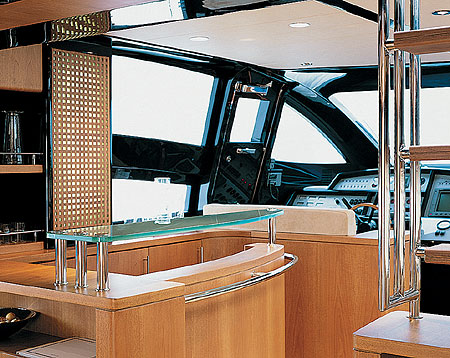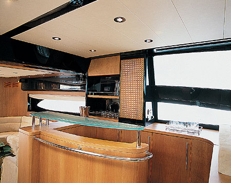 Дерзкое дизайнерское решение – сочетание пластика и дерева. Светлый матовый орех и темно-голубой, почти до синевы пластик создают небывалый антураж роскоши поистине королевской. Кухня убрана с глаз долой «этажом ниже», и от входа в салон вся палуба видна насквозь до самой рубки – салон с U-образным диваном, опоясывающим прямоугольный стол, фантастический бар и пульт управления составляют единое, удивительное свободное и гармоничное целое. Может быть, самое красивое место на всем судне – бар: изогнутая скрипкой стеклянная дуга хромированными стальными трубками крепится к деревянной стойке, а на заднем плане – глубочайшей голубизны шкафчики из пластика с решетчатыми дверцами из ореха.