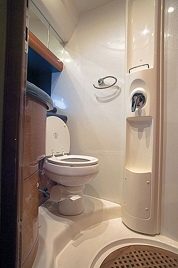 Гостевая каюта правого борта имеет две односпальные параллельные кровати, а левобортовая – двуспальную кровать, ориентированную поперек яхты. Обе каюты имеют гардеробы для верхней одежды и всяческие полки и шкафчики для мелочей. Кондиционер производительностью 40 000 Btu поддерживает во всех каютах желаемую температуру.