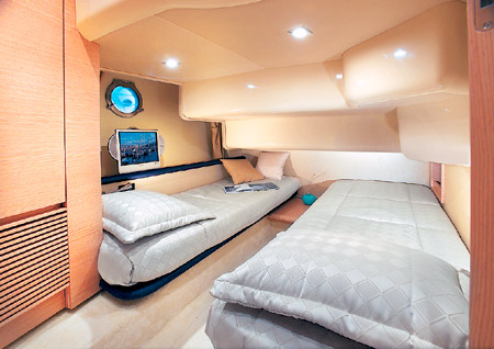 В салоне доминирует хай-тек, минимализм и простые строгие формы. Впрочем, это не равнозначно аскетизму: лодки Azimut – это, прежде всего, модные лодки – по-другому итальянцы просто не умеют. Azimut 40 – очередная бархатная революция в дизайне, признаки которой отчетливо демонстрируют принципиально новые материалы, использованные в интерьере. Вместо примелькавшихся лакированных панелей – матовый выбеленный дуб, приятный не только глазу, но и на ощупь. Для мягкой мебели разработана новая коллекция уникальных тканей – здесь уместно говорить даже не о роскоши, а о чем-то большем. Дело в том, что палитра материалов настолько широка, что сделав непростой выбор, получаешь не просто роскошный, но, что еще важнее, абсолютно индивидуальный интерьер.