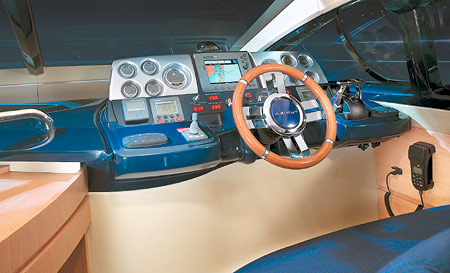 Массу интересных наблюдений можно сделать еще снаружи. Во-первых, необычная форма корпуса – говоря проще, это очень широкая лодка. Специалист, привыкший оперировать языком цирф, наверняка уточнит, что по этому показателю Azimut 40 легко может посоперничать с яхтой длиной этак футов 46. Во-вторых, флайбридж: здесь он максимально длинный, а значит, кормовой кокпит полностью прикрыт от дождя, ветра и прочих погодных казусов. Обычно при такой длине конструкция флайбриджа выглядит громоздко, но на Azimut 40 этого не наблюдается благодаря низкой радарной арке, сдвинутой далеко назад. Кормовой кокпит на Azimut 40 какой-то остроумец уже успел окрестить диско-палубой, и на это есть несколько основательных причин. Двери в салон при необходимости сдвигаются полностью, что позволяет объединить эту площадку с салоном, а значит, создать достаточно места для развлечения весьма многолюдной компании. Кроме того, здесь предусмотрена необычная конструкция стола, которая позволяет убирать его в течение ровно одной секунды – столешница поворачивается вертикально (попробуйте это представить) и задвигается в диван. Решение действительно свежее и раньше нигде не применялось – обычно стол в кормовом кокпите можно лишь сложить или опустить вниз, а чтобы снять стол полностью или, наоборот, вернуть его на место, требовалось потратить некоторое количество времени. Все это позволяет очень быстро получить просторное и абсолютно свободное от лишних предметов помещение, которое можно использовать хоть для танцев, хоть для вечерних посиделок, не обращая внимания на погодные условия.