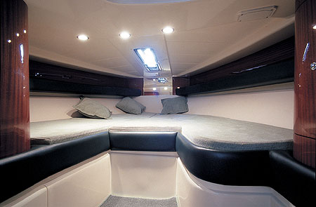 В корме линия борта грациозно и плавно сбегает к ватерлинии, обтекая лежак для загорания. Две его половины белыми крыльями могут взметнуться вверх, открывая взорам «сердце» этой красавицы — спаренные дизели Yanmar общей мощностью в 630 чистокровных скакунов. Этот «табун» разгоняет корпус моногидрон с углом килеватости на транце 16,5° и продольными реданами до скорости в 42 узла — более чем хорошей для такой относительно небольшой и достаточно тяжелой лодки. Конечно, конструкторы позаботились обо всем необходимом для воднолыжников. Для хранения снаряжения предусмотрены специальные крепления в машинном отделении.