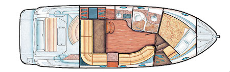 Скользящая дверь из прозрачного акрила и большой светлый люк в потолке пропускают много естественного света в салон, где достаточно места для дружеских сборищ, игр и развлечений благодаря продуманному использованию одних и тех же предметов обстановки для нескольких целей. На ночь обеденный стол убирается и диван раскладывается в широкую двуспальную кровать. Кормовой диван тоже превращается в койку, которая отделяется от салона шторой. Понимающие люди часто морщатся при упоминании о раскладных диванах с отдельными подушками, при помощи которых диван трансформируется в спальное место. Днем эти подушки вечно путаются под ногами, а вечером, когда пора укладываться спать, их оказывается невозможно найти. Потом они обнаруживаются в кокпите, мокрые и просоленные. Бррр!... Ничего подобного на Regal не бывает. Разложить оба дивана не сложнее, чем дома: щелк — и готово! Не забыт и полноценный платяной шкаф. О качестве отделки говорит, например, тот факт, что Regal специально импортирует вишню из Италии, не удовлетворяясь качеством американских сортов. Телевизор Samsung с 15-дюймовым плоским экраном и стереомагнитола с проигрывателем компакт-дисков довершают оборудование салона.
