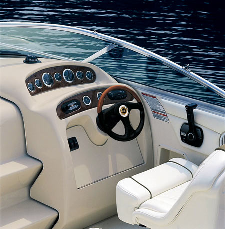 Пост управления содержит полный набор защищенных от влаги приборов Sea Ray SmartCraft с приятной голубой подсветкой. Датчики уровня топлива, давления масла, температуры воды и вольтметр сгруппированы в одном приборе большого формата, а в тахометре соседствуют часомер, датчики расхода топлива и аварийной (включая звуковую) сигнализации, оповещающей о падении давления масла и перегреве двигателя. В таком исполнении панель не перегружена мелкими циферблатами. Кстати, эхолот в отличие от якорной лебедки включен в стандартный пакет, а штурвал с частичной деревянной отделкой регулируется по углу наклона и снабжен гидроусилителем.