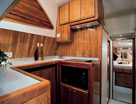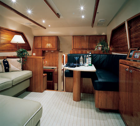 75 децибелл — уровня беседы на слегка повышенных тонах. Рыбу не распугает. Дневная жизнь на борту этого судна также легка и прекрасна, причем не только для любителей рыбной ловли. Неожиданно просторный для лодки такой длины салон отчетливо делится на столовую и гостиную зоны. Кухня «утоплена» на две ступеньки ниже, и ее подковообразная форма избавляет кока от лишней суеты — вот уж действительно «все под рукой».