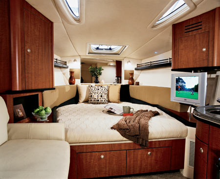 Несмотря на мощь и спортивность, этот «корабль» еще и необычайно комфортен. Судите сами: легко устанавливаемый тиковый стол в кокпите позволяет отлично проводить время за трапезой, холодильник обеспечит прохладительными напитками. Кокпит просторен и эргономичен, в нем без труда размещается шесть-семь человек, а широкие проходы между сиденьями обеспечивают удобное передвижение. Нижние помещения этого катера оборудованы с комфортом, достойным «взрослых» лодок: две каюты, салон с диваном и «конвертируемым» обеденным столом. Ну и наконец, здесь есть настоящая кухня, а не какой-то там закуток. «Удобства» тоже предусмотрены, причем в стандартном оснащении. Движение в сторону «европеизации» дизайна продемонстрировано при помощи замены пластика деревом и использовании по-настоящему дорогих тканей и ковровых покрытий. В качестве опции в салон может быть добавлен LCD-телевизор. Весьма неплохая стереосистема Clarion с 6-дисковым CD-чейнджером также может быть подвергнута масштабному апгрейду — об этом (и многом другом) стоит прицельно поинтересоваться у дилера.