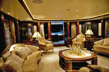 Салон и столовая на десять персон поддерживают роскошь мастер-каюты. Полированное дерево, мягкие ковры, тяжелые портьеры, зеркала, вазы и помпезные кресла окончательно разъяснят, что «дворец на воде» — это не просто место, где надежно и удобно, он обязан ничем не уступать дворцу на суше. Причем за образец лучше взять не покои современных монархов, экономящих деньги налогоплательщиков, а интерьеры периода расцвета империи Габсбургов или другого королевского дома, взгляды которого на роскошь вам ближе.