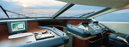 Складывается ощущение, что Карло Галеацци основательно проштудировал гравюры Хокусая, выполненные в стиле «укиё-э», перед тем как создать этот уникальный интерьер: раздвижная перегородка сёдзи отделяет салон от поста управления, обеспечивая полную приватность гостям. Если же вы, наоборот, хотите, чтобы вся верхняя палуба просматривалась от носа до кормы, — ширма одним движением убирается в нишу кухонной стены. Камбуз здесь изолирован от салона… хотя не все так просто. Действительно, прозу быта вы здесь не увидите — она надежно спрятана за дверью. Однако обращенная к столовой стена кухни выполнена в виде барной стойки с электроприводными жалюзи: в закрытом виде они обеспечивают коку полное уединение для творчества, а в открытом позволяют ему не только работать профессиональным барменом, но также быстро и удобно доставлять блюда на расположенный рядом обеденный стол. Что касается оборудования кухни, то абсолютно все здесь: плита, микроволновая печь, холодильник, посудомоечная машина, льдогенератор и многое другое — специально разработанная яхтенная линия от компании Miele. Шкиперу тоже не придется жаловаться на рабочее место — с поста управления просто не хочется уходить, настолько удобно и продуманно место пилота. Штурвал из вишневого дерева приятно держать в руках, на приборной панели — вся необходимая электроника (плюс место для установки опциональных приборов) и, разумеется, внутренняя связь с флайбриджем и машинным отделением.