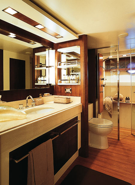 Но вернемся в салон. Мебель из вишни сочетается с теплыми кремовыми оттенками отделочных материалов и мягким, приглушенным светом ламп. Так же как японские художники, Галеацци ориентировался не на игру контрастов, а на полутона и точно продуманные детали. Впрочем, ничто не мешает вам принести сюда собственные представления о прекрасном — количество и разнообразие отделочных материалов могут вас приятно удивить. Элегантная гостиная с парой диванов, креслами и столиком вызывает желание забраться с ногами на мягкие подушки и принять участие в чайной церемонии. Если же вы предпочитаете не столь буддистские способы времяпрепровождения — домашний кинотеатр Sony DAV DZ 100 32 не разочарует. Четыре каюты нижней палубы позволяют с комфортом разместить всех, кто разделит с вами путешествие на Azimut 75: семью, друзей и VIP-гостей. Однако размеры мастер-каюты, занимающей центральную часть палубы, — фирменный росчерк Azimut и пример здорового эгоизма. Никто не спорит, что гостям должно быть комфортно, но все-таки главный человек на борту яхты — ее хозяин. Апартаменты владельца занимают чуть ли не половину всего жилого пространства нижней палубы, поэтому все здесь огромно: монументальная кровать в центре, просторная ванная комната, гардеробная, личный бар. Но это даже не главное — здесь много воздуха и свободного, прекрасно освещенного пространства, а пара трапециевидных иллюминаторов (своего рода «фирменный» знак Azimut) обеспечивает фантастический панорамный вид на оба борта.