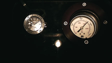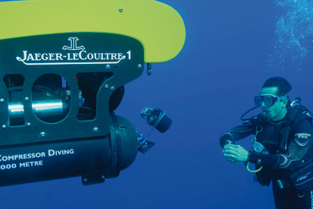 Однако настоящей звездой дайверской коллекции, пожалуй, можно назвать все же не модель с модулем GMT, выдержавшую чудовищные испытания на Гавайях, а часы с механическим глубиномером Jaeger-leCoultre Master Compressor Diving Pro Geographic водонепроницаемостью 300 м. Главная их «фишка» — модуль стрелочного глубиномера с измерительной шкалой от 0 до 80 метров.