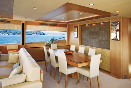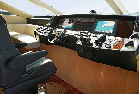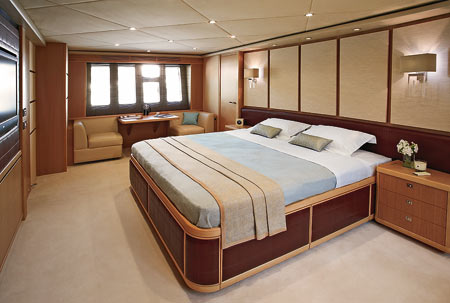 Все эти возможности касаются и «общественных» помещений яхты. Любители темного дерева могут не опасаться — света здесь в достатке. Гигантские иллюминаторы салона тянутся вдоль всего борта и не имеют перемычек. Планировка верхней палубы традиционна: салон, столовая, камбуз и пост управления. Два последних помещения могут быть изолированы от пассажирских зон. Абсолютно приватная зона расположена на носу яхты: здесь есть лежак, диван и сколько угодно солнца и морских пейзажей. Впрочем, приватности ищут, когда хочется убежать от шума и суеты, и если суета зависит от самих пассажиров, то техногенных шумов на борту практически нет. На 95 MY применены последние технологии уменьшения шума и вибрации. Речь не только о том, чтобы как следует «упаковать» двигатели, серьезно проработана и система выпуска, так что яхту можно считать эталоном комфорта. И не только: 95 MY сертифицирована для чартера, что подтверждает высочайший уровень безопасности.