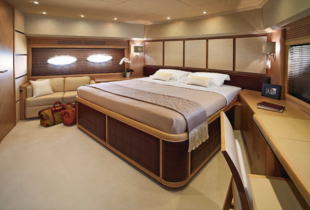Если такие комфортные условия на борту предусмотрены для команды, то можно себе представить, что ожидает владельца яхты и его гостей! Princess 95 MY рассчитана на 8–10 пассажиров. Соответственно, кают может быть четыре или пять. Апартаменты владельца расположены в центральной части корпуса с панорамным видом на оба борта. Ванная и гардеробная расположены между каютой и машинным отделением, «работая» в качестве звукоизолирующей прослойки. Каюты для гостей расположены по правому и левому борту и в носовой части судна. Пятая каюта опциональна: ее можно превратить в кабинет или гардеробную комнату для носовой VIP-каюты. Мы намеренно не останавливаемся на деталях планировки — она легко варьируется согласно пожеланиям владельца. Отделка дает еще больше простора для фантазии. Для оформления интерьера верфь предлагает дуб или вишню. Выбор других материалов также практически неограничен.