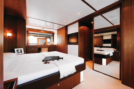 Главная палуба спланирована просто и лаконично: объемный кормовой кокпит, изысканный салон и «формальная» столовая. В интерьере использован темный американский орех, а переборки и мебель отделаны вручную прошитой кожей. Возможности индивидуализировать лодку заключаются не только в широком выборе любых отделочных материалов от тканей до мрамора: поскольку лодка заявлена в сегменте semi-custom, то будущий владелец вправе проявлять фантазию в довольно неразумных пределах.