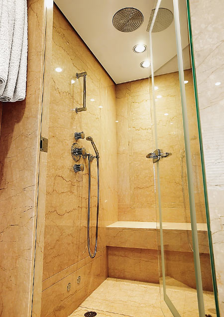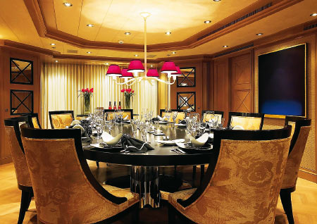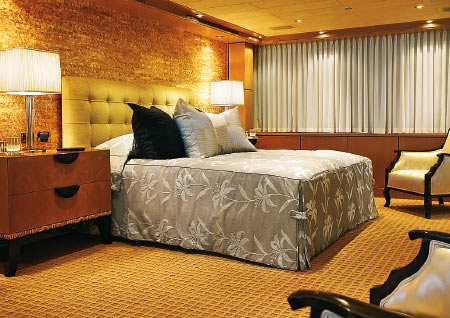 Самые интересные дизайнерские приемы на мегаяхтах обычно можно наблюдать в каюте владельца и VIP-апартаментах. На Secret, однако, интересен и сам состав кают. Например, здесь два помещения для VIP-пассажиров — сьют на главной палубе и каюта на нижней. Первый предусмотрен для «дорогих гостей», вторая — для дочери хозяина (в самом деле — комната для настоящей принцессы). У VIP-сьюта имеются определенные преимущества: два больших иллюминатора по бортам и огромная по площади ванная комната с полом из известняка и гранитным туалетным столиком. Апартаменты любимого чада владельца Secret тоже по-своему интересны: здесь по одному борту располагается ванная комната, а по другому — огромная гардеробная. Сьют владельца с шестью (!) окнами вдохновлен двумя, казалось бы, совершенно не сочетаемыми стилями — ар-деко и Людовик XVI. Получился уютный интерьер в бежево-черных тонах, дополненный дорогим итальянским льном и декором из столь полюбившегося дизайнеру Джиму Харрису перламутра.