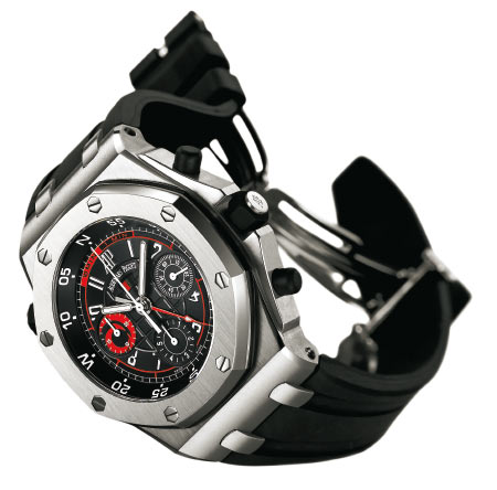 Коллекция Royal Oak — гордость мануфактуры Audemars Piguet. А Offshore — это Royal Oak, выпущенный специально для яхтсменов, причем лучших в мире. Компания Audemars Piguet давно спонсирует швейцарскую Team Alinghi, которая сенсационно выиграла две последние регаты America’s Cup. В 2003 году в честь победы «подшефной» яхты был выпущен тиражом в 1000 экземпляров и быстро разошелся хронограф Alinghi. В отличие от своего предшественника регатный хронограф Alinghi Polaris, выпущенный в честь прошлогодней победы, выполнен не из титана, а из сатинированной нержавеющей стали. Диаметр корпуса — 44 мм. Восьмигранный безель и заднюю крышку удерживают по восемь отполированных винтов, циферблат защищает сапфировое стекло с антибликовым покрытием, а ремешок хронографа, дабы успешнее противостоять въедливой морской воде, сделан из каучука со специальными добавками. Водонепроницаемость Royal Oak Offshore Alinghi Polaris составляет 100 м. Для обеспечения герметичности и комфорта на заводную головку надет резиновый кожух. Мастера Audemars Piguet создавали эти часы для профессионалов и поэтому поместили шкалу обратного отсчета под стекло и заставили ее вращаться с помощью головки на «10 часах». Обычный безель легко сбить в результате контакта со шкотом, парусом или в результате удара о воду.