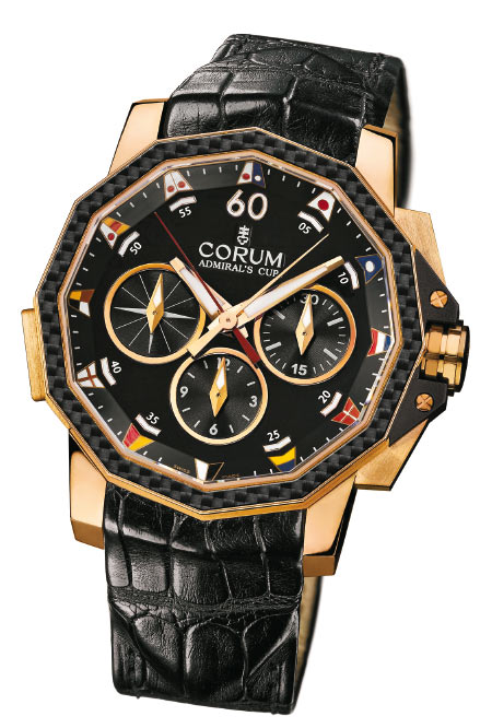 Эта модель также относится к культовым. Многие люди искренне верят, что Admiral — это знаменитая компания, производящая яхтенные часы, а о существовании Corum не подозревают. В этом году модельный ряд Corum претерпел значительные изменения. К сожалению эстетов, прекращен выпуск знаменитых «пузырьков» Bubble, дизайнерских Rocket и Trapeze. Зато расширилась и стала флагманской коллекция Admiral’s Cup. Теперь в ней есть не только профессиональные приборы с индикаторами времени и силы приливов, но и сложные модели с турбийоном, вечным календарем и т.п. Сенсацией прошлого года стали роскошные модели в корпусах диаметром 48 мм из драгоценных металлов. Ну а в этом году в линейке Admiral’s Cup появились модели, которые понравятся любому неравнодушному к парусному спорту человеку. Одна из таких моделей — сплит-хронограф в 44-миллиметровом корпусе из розового золота. Стильный 12-гранный корпус украшает карбоновый безель в тонкой розово-золотой оправе, а также куполообразное граненое сапфировое стекло. Заводная головка защищена каучуковыми выступами. Обратите внимание на необычные кнопки хронографа в форме трапеции. На отметке «8.30» расположилась сплит-кнопка. По традиции часовая разметка от 1 до 12 выполнена флажками-символами морского международного кода. Что касается механизма, то это значительно доработанный мастерами Corum «отраслевой стандарт» ETA/Valjoux 7750, получивший название CO-986. Функция сплит позволяет засекать длительность двух процессов, происходящих одновременно. Например, сравнивать скорости двух яхт. Полезная штука, как для штурмана, так и для болельщика.