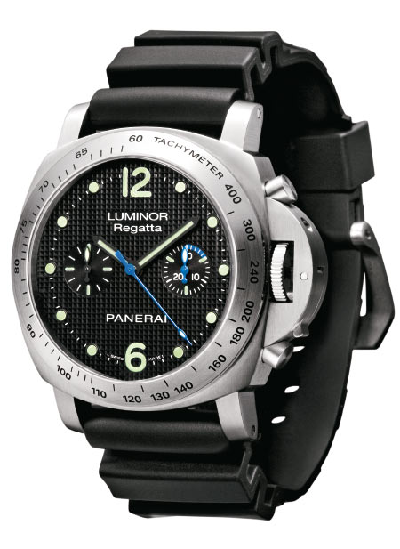 Легендарный итальянский бренд — еще один непременный участник обзоров яхтенных часов. Во-первых, потому что Panerai — производитель первых водонепроницаемых часов для итальянского подводного спецназа. Во-вторых, эта компания ежегодно проводит регату Classic Yachts Challenge, ну и, наконец, поскольку это один из самых актуальных у нас брендов. Новинка этого года — Luminor Regatta Chronograph. В отличие от прошлогодней версии это обычный хронограф, без сплит-функции. Знаменитый подушкообразный корпус из стали имеет диаметр 44 мм и водонепроницаемость 100 м. На месте и главная отличительная черта легендарных часов — фирменный рычаг, защищающий и утапливающий заводную головку. В блок рычага интегрированы кнопки хронографа. На сатинированном безеле выгравирована тахиметрическая шкала. Сапфировое стекло имеет с обеих сторон антибликовое покрытие. Черный циферблат декорирован узором Clous de Paris, который также не бликует на солнце и позволяет считывать показания стрелок практически под любым углом. Оживляет гамму military-часов голубая центральная секундная стрелка, а также небольшой сектор шкалы 30-минутного счетчика. Как вы уже догадались, эта функция нужна для замера предстартовых пяти минут.