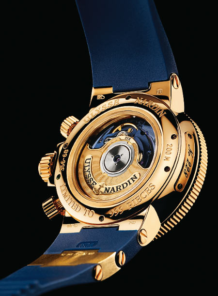 Ulysse Nardin с 1842 года прославилась как производитель точнейших стационарных морских хронометров, за совершенство которых удостоилась не одного десятка наград. Сейчас Ulysse Nardin продолжает удерживать титул одного из лучших производителей теперь уже наручных морских хронометров. Яхтенный хронометр Maxi Marine — лучшее тому доказательство. Лишенный каких бы то ни было дополнительных функций, кроме календаря и индикатора запаса хода, сдержанный и немного винтажный хронометр утверждает вечные ценности Ulysse Nardin. Корпус Maxi Marine имеет диаметр 41 мм и изготовлен из розового золота, а часть задней крышки, которая соприкасается с кожей, изготовлена из гипоаллергенного титана. На боковине корпуса у отметки «9 часов» на двух вороненых винтах прикреплен шильдик с номером модели. Водонепроницаемость Maxi Marine составляет 200 м. При этом часы укомплектованы каучуковым ремешком со вставками из розового золота.