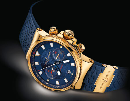 Ulysse Nardin с 1842 года прославилась как производитель точнейших стационарных морских хронометров, за совершенство которых удостоилась не одного десятка наград. Сейчас Ulysse Nardin продолжает удерживать титул одного из лучших производителей теперь уже наручных морских хронометров. Яхтенный хронометр Maxi Marine — лучшее тому доказательство. Лишенный каких бы то ни было дополнительных функций, кроме календаря и индикатора запаса хода, сдержанный и немного винтажный хронометр утверждает вечные ценности Ulysse Nardin. Корпус Maxi Marine имеет диаметр 41 мм и изготовлен из розового золота, а часть задней крышки, которая соприкасается с кожей, изготовлена из гипоаллергенного титана. На боковине корпуса у отметки «9 часов» на двух вороненых винтах прикреплен шильдик с номером модели. Водонепроницаемость Maxi Marine составляет 200 м. При этом часы укомплектованы каучуковым ремешком со вставками из розового золота.