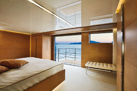 Мы не стали рассказывать вам об отделке яхты, так как верфь Sanlorenzo предлагает огромный выбор пород дерева, камня и текстиля. Но нам показалось, что аскетичный на первый взгляд интерьер гармонирует с военным обликом яхты и за счет исключительно дорогих отделочных материалов все же располагает к отдыху и удовольствиям.