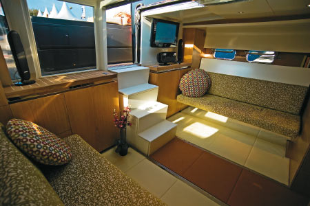 При первом взгляде на Continental 50 кажется, что это просто открытая, быстрая лодка гладких очертаний. Затем останавливают на себе взгляд детали. Во-первых, пара «дверей» со стороны фальшбортов (уж точно не для того, чтобы было удобно подходить на тендере, — для этого существует вполне гостеприимная кормовая платформа). Нет, это вообще не двери, а откидные «балконы». Идея в том, чтобы максимально открыть кокпит, если вы встали на якорь, к примеру, в одной из красивейших бухт Сардинии; увеличить палубу и снабдить вас еще одной удобной площадкой для купания и дайвинга. Это, кстати, блестящая альтернатива для тех, кто не любит слезать с кормы, предпочитая держаться подальше от устрашающего вида винтов с приводом Арнесона. Такие «балконы» вы, конечно, видели и до этого — на суперъяхтах, особенно «модных», тех, у которых есть «пляжные» зоны в апартаментах владельца или на нижней палубе. Чтобы заставить такое решение «работать» на 50-футовой лодке, нужно было исхитриться, а кроме того, усилить корпус, особенно фальш борта, которые укрепили по тому же принципу, что двери автомобилей с откидным верхом. Гидравлические замки не позволяют им неожиданно открыться на ходу — никто не хочет уронить друга за борт на скорости 45 узлов.