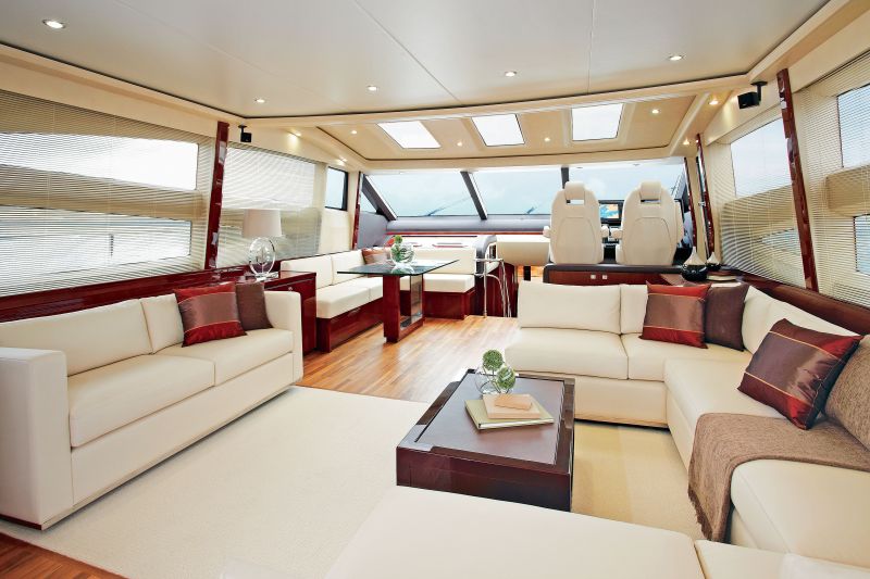 Кокпит V78 визуально разделен на две части. В теневой зоне — U-образный диван, стол, бар с холодильником, электрогрилем и отделением для напитков. Открытую зону оценят любители пляжного отдыха: большая купальная платформа и огромный лежак для загорания, под которым скрыт гараж для тендера или гидроцикла. В носовой части палубы есть еще один лежак, который опционально можно оснастить электроприводными подголовниками. На нижней палубе расположены четыре каюты и камбуз. Мастер-сьют по традиции занимает площадь от борта до борта и расположен в середине корпуса, в самой широкой его части (5,6 м). Каюта, благодаря интересной планировке, очень приватна: кровать расположена по ходу лодки — изголовьем вперед и даже при открытой двери остается за пределами видимости. Естественно, главная каюта яхты оснащена объемной ванной комнатой и отдельной гардеробной. Шезлонг, туалетный столик, большой LCD-экран, стереосистема… По каждому борту четыре больших иллюминатора, и часть из них открывается — ведь даже при наличии продвинутой системы климат-контроля (а она здесь, конечно, есть) иногда хочется простого, необработанного, морского воздуха.