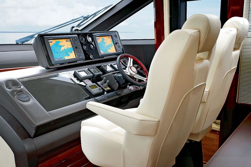 В салоне главной палубы обычно составляется первое и зачастую главное впечатление о лодке в целом, ее стиле и эргономике. Салон Princess V78 почти прозрачный: масштабное бортовое остекление дает хороший круговой обзор, а лобовое стекло выполнено без тонировки, что улучшает видимость в темное время суток. Гигантский сдвижной хард-топ позволяет открывать почти половину салона, но даже если он закрыт, три прозрачных люка пропускают достаточно света. В передней части салона расположены пост управления и столовая, ближе к кокпиту — гостиная: пара диванов и кофейный столик. Невысокая лаконичная мебель — еще один способ добавить света, а темное дерево и светлый текстиль подчеркивают легкость и благородство линий — за лодками Princess давно и прочно закрепилось понятие современная классика. Впрочем, то, что вы видите на фотографиях, далеко не единственный вариант интерьера. Деревянная отделка может быть выполнена из темной вишни или светлого дуба, как всегда, на выбор заказчика предлагается богатая палитра текстиля — тканей, ковров, штор и жалюзи. LCD-экран, скрытый в нише за стеновой панелью, система пространственного звучания Bose, бар с холодильником и отделением для бокалов — здесь приятно отдохнуть и в одиночестве, и в компании. А если компания большая — открываем прозрачные двери салона и получаем еще столько же дополнительного пространства в кормовом кокпите.