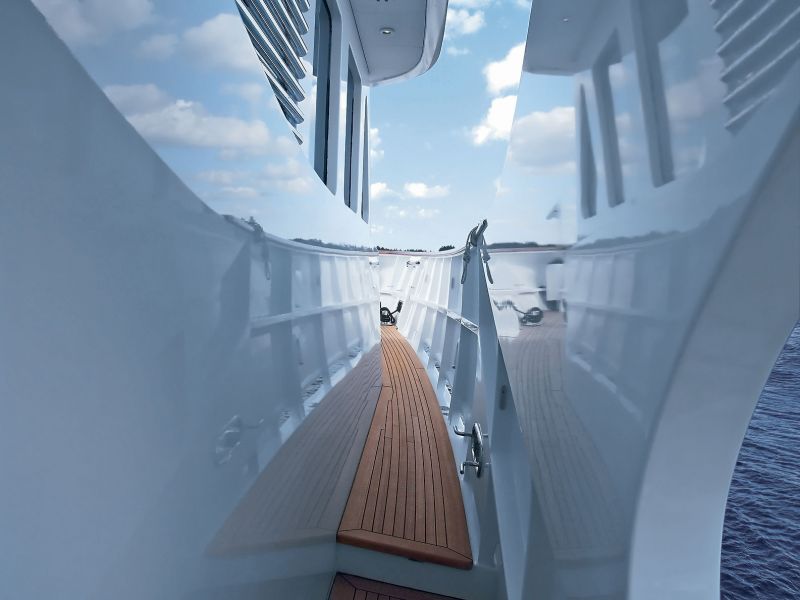 Находясь на флайбридже, периферийным зрением замечаешь технические аксессуары: дополнительный пульт управления, мачта с положенным количеством устройств, сигнальные медные трубы, грамотная подсветка. Кажется, просто, но руки электриков-монтажников продели, протиснули, подсоединили сотни метров проводников, доступ к которым невидим, но присутствует. Комфортное и безопасное жизнеобеспечение яхты: связь, навигация, развлечения, бытовые нужды и изыски — все на должном уровне. Леера, дверцы, якорные ниши и все прочее, что должно сверкать, сверкает. Получилось, потому что вырастили свою бригаду сварщиков и шлифовщиков нержавейки.