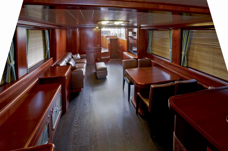 Взгляд изнутри — в салоне и на нижней палубе — ложится на матово поблескивающую вишню: на борту Аэлиты применено декорирование в единой гамме — золотисто-синей в салоне и золотисто-желтой внизу. Пять пассажирских кают, просторный салон, соединенный с рубкой и кухней, санузлы, коридоры и лестницы решены в морском стиле. Единые горизонтальные поверхности, потолочные рамы, стеновые панели, плавные изгибы, галтели и русты — все по правилам. Благородно на вид и талантливо по сути. Проработанность линий, их сложность и вместе с тем незатейливость доставляют эстетическое удовольствие. На Аэлите удалось полностью воплотить изначальный замысел дизайнера. Не уступая ни на йоту, упорно и взыскательно доводя конструкцию, настойчиво и требовательно изготавливая, монтируя и отделывая. В санузлах строгость морского стиля оживляют мозаичные панно из плитки Bisazza: в душевых кабинах, и на стенах, и на полу. Получилось создать настроение и визуально расширить пространство, сделать чисто, аккуратно, без недочетов. В отделке яхты применены материалы с морскими сертификатами от мировых производителей. Для работы с ними нужны не только профессиональные навыки, но и желание сделать добротно и красиво. Что же получилось в итоге?