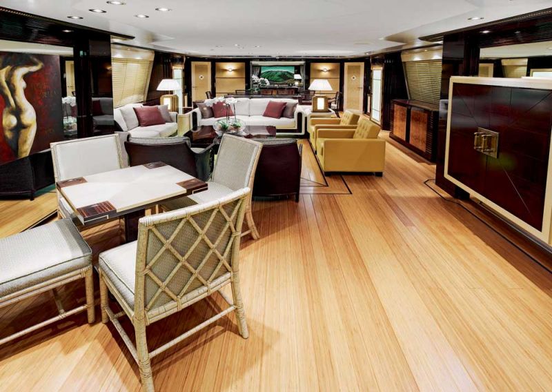 Стиль Дональда Старки: классический, но не слишком, роскошный, но без раздражающих статусных излишеств. Старки умеет сочетать много разных материалов. Например, для отделки верхней палубы выбраны макассар и платан, нижней — очень разные по фактуре зебрано и оливковое дерево, стены ванных комнат выложены белой галькой, а для мебели и пола использованы палисандр, орех, бамбук и венге. Плюс полтора десятка разных типов тканей и кожи, оникс, перламутр, разные виды мрамора. И весь этот оркестр под управлением Старки исполняет дивную симфонию. Уже стало общепринятым мнение, что у Старки это получается именно потому, что он не соблюдает правила, а сам их создает. Именно он перенес многие принципы сухопутного дизайна на суда — принципы, которые раньше ускользали от внимания авторитетов. Меня всегда удивляло, когда иллюминаторы на яхтах делали столь высоко, что, сидя в салоне, невозможно наслаждаться видами, — говорит дизайнер. Дональд Старки внес в планировку яхт логику, и когда сейчас говорят о грамотном разделении пространства пассажиров и команды, неплохо было бы ссылаться на первоисточник. Отдельный респект от яхтсменов Старки заслужил и за нелюбовь к острым линиям — оно, может, и стильно, но придется все время ходить в синяках. Злокозненных углов на Allogante практически нет, зато много вкусных небанальных деталей. Барные стойки в кормовом кокпите и на верхней палубе — настоящие арт-обьекты из подсвеченного стекла. Верхняя палуба действительно палуба, а не флайбридж. Впечатляют ее размеры и разделение — на свет и тень. Центральная часть, где расположены обеденная зона и бар, прикрыта хард-топом, а пляж с джакузи остается под солнцем.