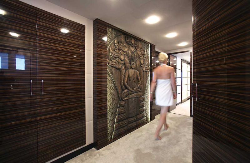 Художественное оформление интерьера — несомненная удача Джулии. На лодке нет ни золота, ни вообще ничего блестящего. Она умеет видеть красоту в обыкновенных, подчас даже грубоватых предметах, и так вписывать их в рафинированную обстановку, что вещь приобретает статус арт-объекта. Как, например, резное деревянное панно, купленное в антикварной лавке где-то в Тайланде и теперь украшающее холл перед входом в мастер-каюту.