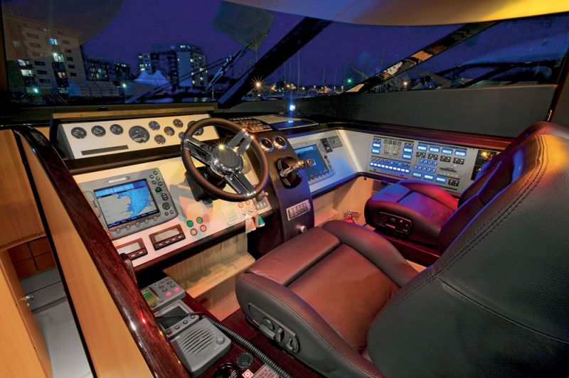 Команда обитает в корме, и здесь тоже возможны варианты: компактная двухместная каюта с санузлом плюс гараж для тендера либо расширенная зона экипажа с отдельным камбузом и собственным мини-салоном. Второй вариант, кажется, более популярен: именно такую планировку выбрали владельцы всех последних корпусов Squadron 78. Команде — больше комфорта, ну, а тендер отправляется на флайбридж или кормовую платформу, где умещается лодка длиной до 3,85 м, да и проблем со спуском на воду меньше: нажал кнопку — и гидравлический привод опускает платформу, оставляя тендер покачиваться на воде. В любом случае, есть возможность держать на борту сразу два плавсредства — разъездной тендер и гидроцикл. С флайбриджа «малый флот» спускается тоже без проблем — при помощи крана, выдерживающего нагрузку до 375 кг. Места наверху вполне достаточно, чтобы тендер или jet-ski не мешали вам отдыхать. В центре флайбриджа — обеденная зона с баром, диваном и столом на телескопической ножке: опустив стол и вложив подушки-заполнители, получаем огромный лежак. Еще два дивана сгруппированы вокруг верхнего поста управления — весьма серьезно упакованного, как это всегда бывает у Fairline: приборная панель полностью дублирует возможности основной рубки. Пожалуй, именно на флайбридже от управления этой лодкой можно получить максимум удовольствия: сидеть удобно, обзор отличный, «солнце, воздух и вода» в наличии, а под ручкой газа — три с лишним тысячи лошадей, и все ваши.