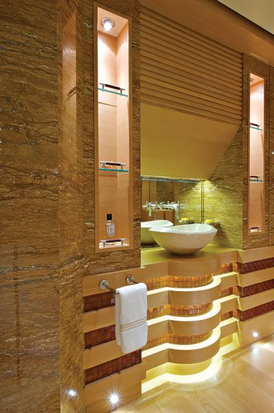 Мастер-каюта, конечно же, от борта до борта, выдержана в естественных, спокойных тонах, с доминантой в виде шкафа по центру, куда встроен плазменный экран — эдакий «Черный квадрат», рефренами которого смотрятся черные квадраты оконных жалюзи и черные вставки из тисненой кожи в стеновых панелях. Интересно, что полы здесь, как и в салоне, сплошь застелены белым ковром, а потолок обит палубной доской. Бэрриман многое делает против ожидания. Скажем, хозяйская ванна напоминает бамбуковую шкатулку, а из комнатных растений вместо общепринятых орхидей высажены жесткие сансевиерии (в просторечии растение называется «тещин язык»). Впрочем, меховое покрывало на кровати кинг-сайз, уютный глубокий диван и мягкое рассеянное освещение компенсируют некоторую графичность этого интерьера.
