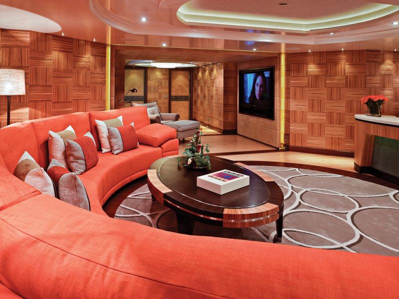 Оттенок бутылочного стекла был подобран для диванов в основном салоне, а морковный оранжевый — по спецзаказу владельца — для полукруглого дивана в скайлаундже. Для того чтобы эргономика диванов соответствовала пожеланиям и привычкам хозяина, дизайнерам пришлось совершить путешествие в одну из его резиденций и, замерив размеры софы, сделать то же самое на яхте, — разумеется, с учетом размера ее помещений.