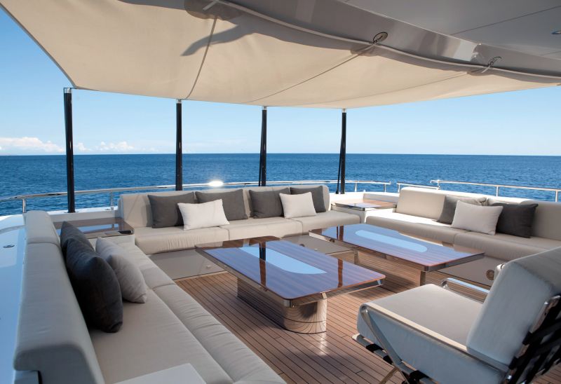 Положение перегородок в главном салоне тоже можно менять, регулируя объем проникающего света. В кормовой части салона располагается бар, поверхность которого выполнена из оникса и подсвечена изнутри. а верхней палубе C-образный диван и пара кресел (их, кстати, можно объединить в софу) гармонично вписываются в плавные линии интерьера. Настроение помещения легко меняется благодаря раздвигающимся перегородкам из эбенового дерева или палладия, а также шторам. Здесь тоже есть свой бар, а телевизор изящно вмонтирован в зеркало. При этом центральная часть потолка сделана из тонких слоев палладия, а боковые — из древесины белого клена.