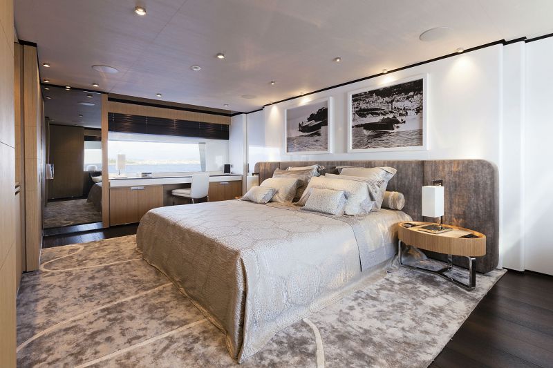 Стеклянная перегородка отделяет салон от центрального фойе со спиральной лестницей, отделанной нержавеющей сталью и кожей. Лестница соединяет все три палубы яхты. Двигаясь дальше в сторону носовой части, попадаешь в апартаменты владельца, которые включают в себя кабинет, спальню во всю ширину судна, гардеробную и ванную комнату, отделанную травертином, с ванной по центру и отдельной душевой кабиной. Вся мебель в каюте, включая изголовье кровати и прикроватные столики, выполнена по индивидуальному заказу.