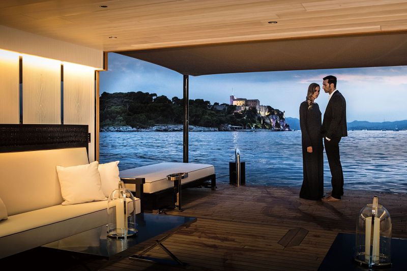 Кормовой сегмент главной палубы выполняет сразу несколько функций. Он используется для хранения двух 9-метровых тендеров-лимузинов, спроектированных Nuvolari Lenard. Достаточно спустить их на воду с помощью кранов и воспользоваться инновационными откидными бортами, и эта зона становится логическим продолжением пляжного клуба. Гости могут загорать или обедать, находясь под защитой тента, а вечером смотреть кино на большом экране или устраивать дискотеки.