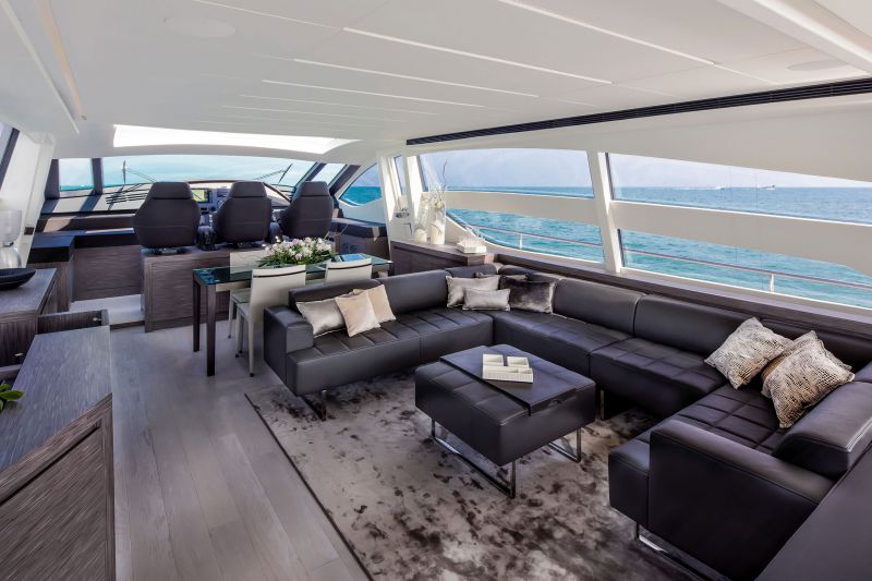 Итак, сразу после насыщенного эмоциями и скоростями дня на воде эта яхта превращается в красивое и комфортабельное пространство для наслаждения панорамными видами. Во всех гостевых зонах Pershing царит атмосфера спокойствия и умиротворения. Темная и светлая древесина дуба с контрастными прожилками в сочетании с темно-серыми лакированными деталями придает изысканности главному салону – просторному, приятному и наполненному воздухом и светом помещению, в котором гости могут почувствовать себя легко и непринужденно, отдыхая в окружении мебели всемирно известной итальянской марки Poltrona Frau. Например, удобно устроившись на огромном кожаном диване Quadra или за деревянным столом Laurana со стеклянной столешницей. Фабрика Poltrona Frau является одним из давних и хорошо известных партнеров верфи, поэтому именно ей было поручено заняться отделкой еще и поста управления. Три эргономичных спортивных кресла для капитана и пары гостей – также работа Poltrona Frau.