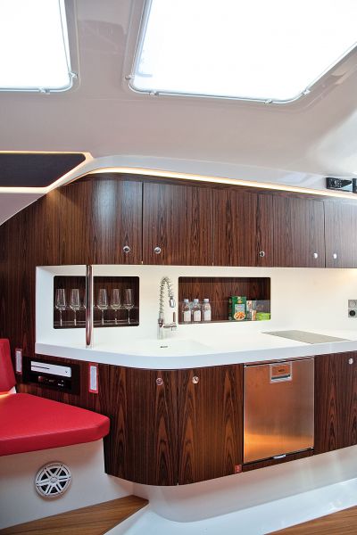 Катер с нашим фотографом откровенно не успевал за Alisa, шедшей на всех парах, и заснять ее на максимальной скорости было непросто. Увидеть лодку на полном ходу мы смогли только в акватории Клязьминского водохранилища, где нет скоростного лимита. В условиях городского водоема испытать, как катер ведет себя на волне, мы толком не могли, но целый ряд авторитетных изданий, опробовав Demon в море, засвидетельствовали, что лодка отлично держит курс, легко и непринужденно режет волну и при этом оставляет кокпит абсолютно сухим. Это особенно впечатляет, учитывая, что Demon – первая полноценная морская моторная яхта от верфи, все это время считавшейся производителем катеров для использования на реках и озерах. Далее, с одной стороны – это чистокровный спидбот, напоминающий о временах флоридских контрабандистов с их построенными по спецзаказу лодками, за которыми не могли угнаться катера береговой охраны. С другой – максимально обитаемый круизер выходного дня. Alisa оборудована аудиосистемой JL Audio с 25 динамиками общей мощностью 6000 Вт. На борту есть все удобства для комфортного ночлега вчетвером, туалет, душ, камбуз и просторный салон-столовая, а также много ящиков и шкафчиков для хранения вещей.