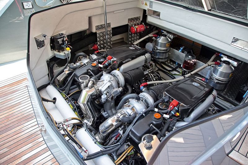 Дизайнерам верфи непостижимым образом удалось создать лодку, одновременно напоминающую выныривающего из воды кита и... истребитель. Продольные реданы на корпусе напоминают полосы на брюхе финвала, а по бокам так и хочется дорисовать крылья с подвешенными на них ракетами или ПТУРСами. Семейная верфь с 90-летней историей, Frauscher давно поклоняется богу скорости и даже выпустила именную версию одного из своих катеров, посвященную гонщику-водномоторнику Дино Фельтринелли (Фраушеры и Фельтринелли дружат семьями). Frauscher 1414 Demon – флагман верфи. А экземпляр, который прибыл в Россию – самый быстроходный Frauscher. Таковым его делают два 9-литровых двигателя Mercury Racing с двойным турбонаддувом мощностью по 1100 л. с. каждый. Они обеспечивают Alisa – такое имя дал катеру владелец – максимальную скорость 67 узлов – уникальный показатель для 14-метровой лодки с круизным интерьером и водоизмещением 12,8 т.