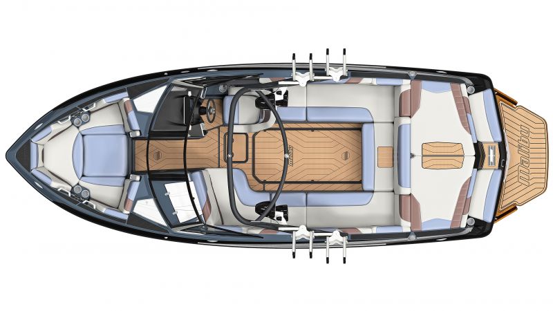 Стоит отметить, что все сиденья выполнены из необычайно мягкого материала, который не нагревается от солнечных лучей и не впитывает влагу. Палуба буксировщика полностью покрыта специальным нескользящим материалом SEADEK, одним из самых устойчивых к любым видам загрязнений. Вставки из этого материала присутствуют на кормовых сиденьях катера в виде степов, образуя Run Way из трех дополнительных ступенек, ведущих к купальной платформе. Создатели Malibu 23 LSV решили сделать перемещение по палубе еще безопаснее и комфортнее за счет изменения конфигурации аудиосистемы Wet Sound, расположенной на тауэре. Колонки теперь находятся намного выше и не ограничивают передвижение пассажиров по палубе.