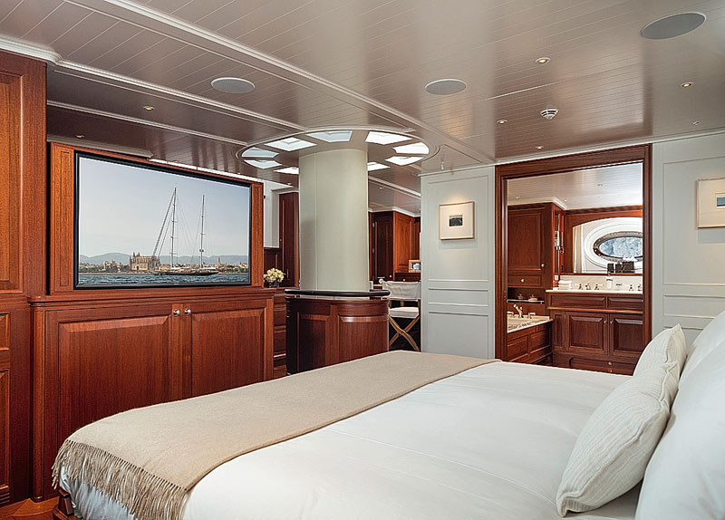 А всю кормовую часть занимают двухуровневые хозяйские апартаменты. Слева от входа кровать (из тумбы перед ней выдвигается телевизор), справа ванная комната (отделанная мрамором и с полноразмерной ванной), далее гардеробная и рабочий кабинет, лестница наверх ведет в свой мини-салон с выходом на палубу. Здесь хочется сделать важную ремарку. Весь интерьер является прекрасным образцом исключительной работы Royal Huisman с клиентами: им не просто показывают 3-D картинки будущих кают – верфь строит макеты помещений в масштабе 1:1.