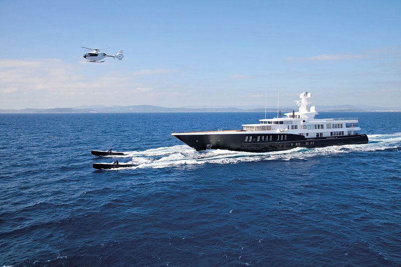 81-метровая Feadship Air недавно прошла рефит и предстанет в Монако в обновленном виде. Особенностью яхты является не только огромная плоская палуба с бассейном в носовой части, но и особое матовое покрытие корпуса, которое не нагревается на солнце, несмотря на темный цвет. Это одна из самых больших яхт Feadship, сдающихся в чартер. Она имеет семь кают и рассчитана на 12 гостей. Дополнительный электрический двигатель позволяет ей медленно двигаться в режиме троллинга, так что гости могут рыбачить прямо с купальной платформы.