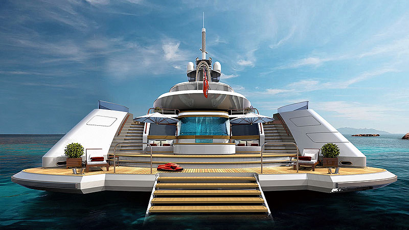 Пляжный клуб на транце задуман двухуровневым. На верхнем этаже будет бурлить бассейн с гидромассажем. По его передней прозрачной стене водопад будет низвергаться во второй бассейн, расположенный посреди купальной платформы. Верхний бассейн кажется настолько глубоким, что в него можно нырнуть, проплыть под водой и вынырнуть ярусом ниже. В третьем бассейне дно поднимается, и его можно превратить в танцпол.